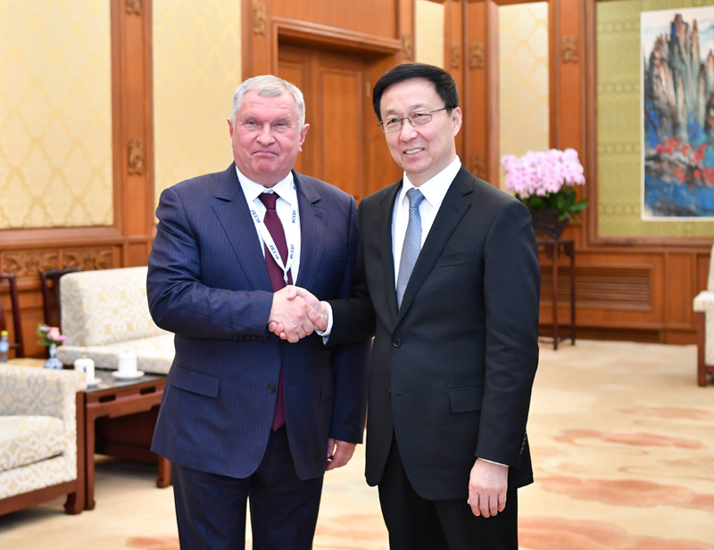 11月29日,中共中央政治局常委、国务院副总理韩正在北京钓鱼台国宾馆会见来华出席中俄能源商务论坛的俄罗斯联邦总统能源发展战略和生态安全委员会执行秘书、俄罗斯石油公司总裁谢钦。新华社记者 殷博古 摄